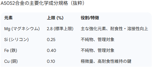 A5052の特性を決定づける主要な化学組成はマグネシウム(Mg)であり、強度と溶接性の向上に寄与します。